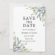 Modern Elegant Delicate Watercolor Botanical Greenery Wedding Engagement Announcement Save The Date Card includes green foliage, dusty blue leaves, sage green leaves and other beautiful botanical greenery. Photo Back.