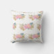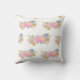 Lovely throw pillow adorned with delicate watercolor flowers pattern in pastel pink and peach colours with green and blue/grey foliage on white background. Very decorative and romantic style.