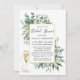 Modern Elegant Delicate Watercolor Botanical Greenery Bridal Shower Invitation Card includes green foliage, dusty blue leaves and other beautiful botanical greenery. Gold Frame. Sage Green Back. Watercolor Champagne Glass with Ribbon.