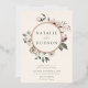Elegant winter floral wedding invitations featuring your names encircled by a rose gold foil wreath with watercolor flowers and foliage on an ivory background. The winter flowers feature a colour palette of dusty rose, light pink, ivory, and soft golden yellow with eucalyptus leaves and winter foliage in shades of sage green and rich forest green.