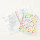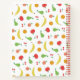 Chic spiral recipe notebook with a pattern of delicious fruit--bananas, apples, oranges, pears, cherries, and peaches--where you can add your name and the subject of the notebook on a charming label.