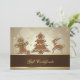 Elegant and delicious Christmas illustration: Decorated gingerbread Christmas tree, gingerbread man and gingerbread deer with golden stars on a brown bokeh background.