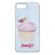A personalised phone case with an illustration of a delicious cupcake with pink swirls and a berry with leaves nestled in the frosting.