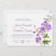 Beautiful delphinium spikes painted purple botanical art watercolor botanical wedding invitation. Edit this wedding invitation with your own name, event details and wording. Other matching wedding items available. Unique design and original watercolor fine art painting by Sarah Trett. www.sarahtrett.com for www.mylittleedenweddings.com