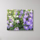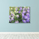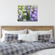 Wrapped canvas art is shown with a photo print of pretty purple delphinium flowers.