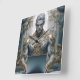 Mystical warrior with horns and ornate gold armor working intently on a laptop in a baroque setting. Powerful motif for fantasy fans, gamers, and tech enthusiasts with a sense of epic aesthetics.