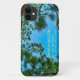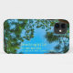"Dendrophile" meaning custom text colour iPhone 11 Case. This unique phone case features the word "dendrophile", representing a person who loves trees, set against a stunning image of pine tree branches against a bright blue sky. The text colour can be customised to suit your personal style and preferences.