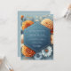 Embrace the warmth of the season with this stunning artistic design. A sophisticated palette of denim blue and slate provides a cool backdrop for vibrant, amber-hued marigolds and chrysanthemums. Delicate cream and light blue daisies are scattered throughout, complemented by soft, muted greenery for a beautifully balanced botanical arrangement.