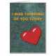 This card has an aged an faded demin background just like your favourite jeans. The words I was Thinking of you today, are rendered as though embroidered with a big red embroidered heart .