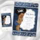Denim and diamonds baby shower invitations with adorable ethnic African American baby girl wearing a cute denim and diamond outfit with pretty silver jewel crown on a beautiful denim and diamond background. You can easily customise these cute denim and diamond baby shower invitations for your event by simply adding your details in the font style of your choice. This is a printed design with no real diamonds, glitter, jewels, denim, etc.