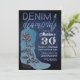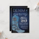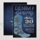 A modern, elegant and chic 30th birthday party invitation with a denim and diamonds theme. It features a denim background, a denim blue cowgirl boot with an elegant rose covered in rhinestones (this is a digital effect), and typography in white. A chic, stylish and classy "denim and diamonds" design for a woman on her thirtieth birthday!
