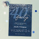 A modern, elegant and classy 40th birthday party invitation template for women featuring a denim background, diamonds / rhinestones drips (simulated, not real diamonds) in a hanging curtain style, the word FORTY with a rhinestones effect and modern typography in white. A chic "denim and diamonds" design for a woman on her fortieth birthday.