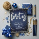 A simple, modern, elegant and chic 40th birthday party invitation template for women featuring a blue denim background, the word FORTY in modern calligraphy and with a rhinestones and glitter digital effect, and typography in white. A chic, glam, stylish, trendy and classy denim and diamonds invite for a woman on her fortieth birthday!