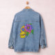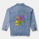 If you are looking for a cool denim jacket or some cool skull artwork , this abstract skull print denim jacket is the best of both worlds. This skull print blue jean jacket features an abstract line art style skull with a flower head piece, in shades of yellow, green , pink , purple, and blue. Original ink and pencil artwork by The Gifted Grackle.