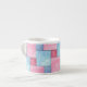 A pretty, espresso mug, with a patchwork of pink and blue denim pattern, from a handpainted watercolour design by Judy Adamson.