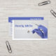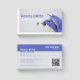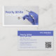 Dental Care Clinic White Business Card highlights a photo of hands in blue gloves holding dental tools in a white background with an accent white corner strip at the left bottom side. The business name is inside the proximate boundary of the dental tools to emphasize it. The use of only blue and white colours is purposely set to achieve a minimalist design.