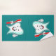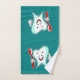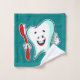 Towels with an illustration of a cartoon style big white tooth smiling happily holding a red toothbrush and giving the thumbs up sign.