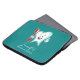 Laptop sleeve with an illustration of a cartoon style big white tooth smiling happily holding a red toothbrush and giving the thumbs up sign.