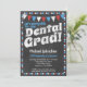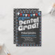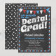 A fun and unique dental graduation party invitation in chalkboard style with red, white and blue flags and a whimsical polka-dot border with dots on the back.