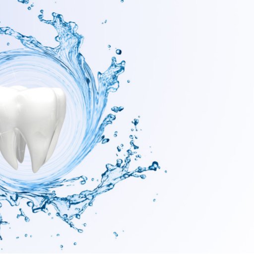Design for dental purposes: White clean shiny tooth with water splash on a white-blue background. Perfect for any business related to dental treatment like oral surgery, dental office, medical office, doctor office, clinic or hospital. For hospital staff, oral surgeons, physicians, nurses; classy, noble and elegant.
