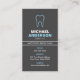 Stylish, dark grey, vertical dentist or dental assistant business card featuring a blue outline of a tooth. Customisable name, title, business name and contact information on the front. Dark grey back. A bold and modern design for a dentist, hygienist or any other dental professional.