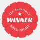 Award your next derby day horse race night winners with these fun 'first place' WINNER stickers. They feature a red equestrian rosette background. All text is customisable, so you can add names etc
