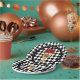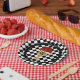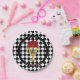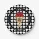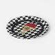 Party paper plates - in 2 sizes - feature a gold trophy filled with red roses on a black and white check background with your names and date in chic lettering.