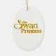 Oval shaped Christmas tree ornament featuring embracing animated characters, Princess Odette and Princess Derek, from The Swan Princess. The back of the ornament has The Swan Princess logo.