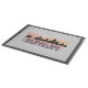 Stylish glass cutting board features Des Moines IA city skyline silhouette with watercolor splash and latitude & longitude map coordinates with grey framed background,