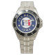 Has heft and feel of expensive stainless steel quartz watches. Good band with safety catch. I removed links, which is easy because engraved arrows show direction to push the linking pins. As always by this seller, the image (a railroad logo) is a perfect reproduction of my emailed image, and is precisely spaced and aligned.