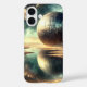 A massive metallic sphere hovers over a reflective, barren landscape, creating an eerie yet mesmerising scene. The sky is filled with vibrant, swirling clouds, casting dramatic reflections in the water below.