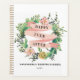 This wedding planner features a decorative cactus wreath with a prickly pear cactus a pink blossom. In the centre it says "happy ever after" in a black serif font. You can personalise with your names and year. Colours include green, pink, white and black.
