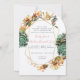 Terracotta Coral Millennial Pink and Green Destination Desert Cactus Succulent Gold Geometric Abstract Framing this Wedding Typography Including FairyTale Quote on back. Tuscany Yellow and Sage Green Wedding Invitations