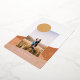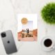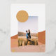 A modern and minimalist landscape design with terracotta and clay colored mountains and a golden yellow sun behind a personalized photo, holiday greeting and real gold foil cactus designs.