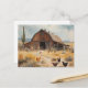 This charming postcard design showcases a rustic wooden barn set against an open countryside backdrop, complete with free-roaming chickens and wide blue skies. The warm tones of the barn and golden fields create a nostalgic feeling of rural simplicity and timeless farm life.