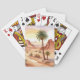 Playing Cards in an illustration of a serene desert landscape showcasing golden sand dunes and rocky formations under a pastel sky, with lush palm trees scattered throughout. The soft, warm colours evoke a sense of tranquillity and natural beauty.