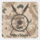 A military brown "subdued" style depiction of a Maccabee's shield and two spears on a desert camo background.  The shield is adorned by a lion and text reading "Yisrael" (Israel) in the Paleo-Hebrew alphabet. English text reading "Maccabee" also appears.
