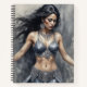 A watercolor capturing the essence of belly dance under the moonlight. The dancer shines with a silver costume that reflects her grace and movement.