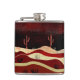 Abstract landscape scene of a desert with saguaro cactus, scrub brush, hills, and stars in shades of red, crimson, and beige and bold textures.