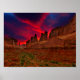 Beautiful photo shot taken in the desert at twilight! The sky burns in beautiful shades of dark blue, pink, red, and purple colour. This dry desert photo scene is filled with smooth red rock and small green plants.