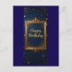 Golden elegance, birthday background, a luxurious design with a golden frame, golden confetti, and "Happy Birthday" in shimmering gold on a navy blue background.