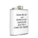 Size: Vinyl Wrapped Flask, 6 oz. Customise this 6 oz. Liquid Courage™ stainless steel flask for a fun and hip on-the-go accessory. Your text, photos or designs are professionally printed in vibrant colour on high quality vinyl and permanently wrapped around the flask. The Liquid Courage™ flask is a great gift for weddings, birthdays, and special events! Six Ounce (6 oz.) Stainless Steel Flask with attached screw top lid. Dimensions: 3.75""l x 4.5""w x 1""d. Designs printed on high quality vinyl and permanently wrapped around the flask. Handmade in U.S.A. Hand wash with warm water.