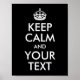 Change the text design on this classic vintage "Keep Calm and Carry On" poster design. White crown and block text. Create a parody poster for your wall. You can change the black background colour.