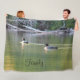 Stylish cottage decor large fleece blanket with a pair of loons. Wildlife themed, with greys, olive greens and black. Personalise the text to suit your home or a beautiful warm custom family gift.