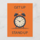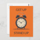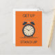 This post card has a simple desk clock illustration against solid orange background with the customisable "get up, stand up" text.