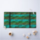 Wavy pattern in greens. Four shades of green worked in crochet. Two vertical black bands at either side.
