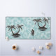 Tropical scene with two islands, each with two palm trees. sailing between the islands is a small sail boat. Images are black silhouette against a watery blue-green background.