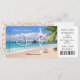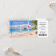 A fun but stylish wedding invitation in a boarding pass/ticket style for couples getting married abroad in The Maldives which is shown in a white map silhouette on teal blue, with sweet red love hearts, plane silhouette and swirling heart shape. The reverse of the boarding pass has a pretty elegant lacy pattern.