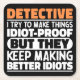 Funny Detective Sayings "Detective I Try To Make Things Idiot Proof But They Keep Making Better Idiots". Grab this Funny Detective design as a funny gifts for an awesome mum, dad or friend.