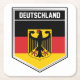 The national flag of Germany is infused into a shield shape and the emblem of the country is set in the center of the flag. The country name of Deutschland is above the image but inside the shield shape.